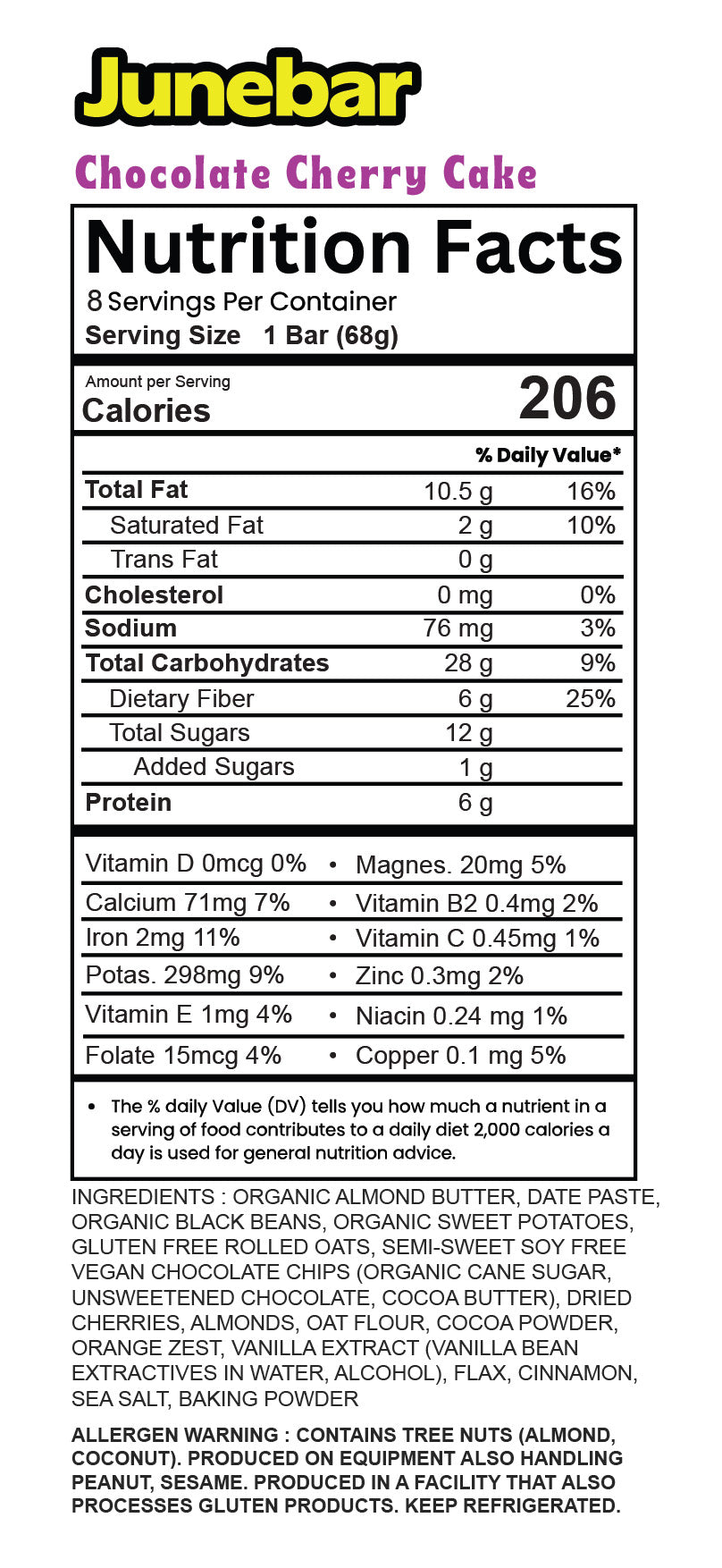 ORGANIC ALMOND BUTTER, DATE PASTE, ORGANIC BLACK BEANS, ORGANIC SWEET POTATOES, GLUTEN FREE ROLLED OATS, SEMI-SWEET SOY FREE VEGAN CHOCOLATE CHIPS (ORGANIC CANE SUGAR, UNSWEETENED CHOCOLATE, COCOA BUTTER), DRIED CHERRIES, ALMONDS, OAT FLOUR, COCOA POWDER, ORANGE ZEST, VANILLA EXTRACT (VANILLA BEAN EXTRACTIVES IN WATER, ALCOHOL), FLAX, CINNAMON, SEA SALT, BAKING POWDER
